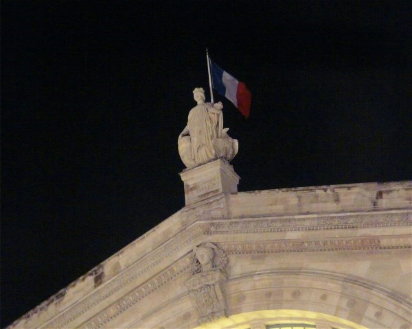 The positive space (object of focus) is the roof of the train building, the statue, and the French flag. The negative space is the surrounding black sky.