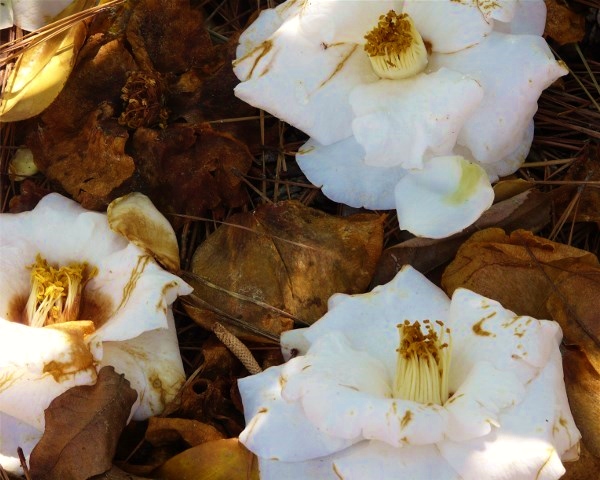 These are lovely camellias that have fallen off the bush, and are lying on a bed of dried leaves & pine needles. Of course, the positive space are the camellias themselves, and the negative space is the ground with dried leaves etc.
