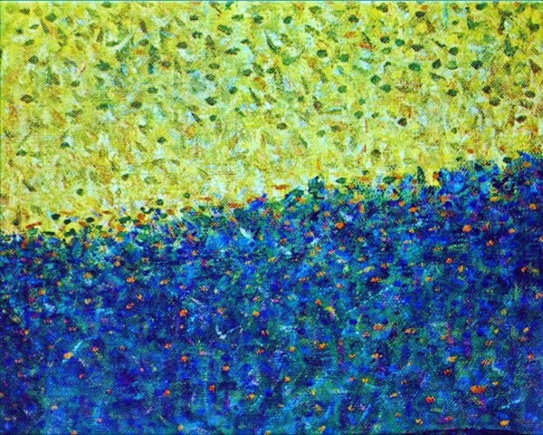These scientists observed that if you put two colors next to each other, from a distance the eye perceives them as combined into a third color. Also, the unadulterated colors when juxtaposed have a tendency to illuminate each other until they sparkle with light.